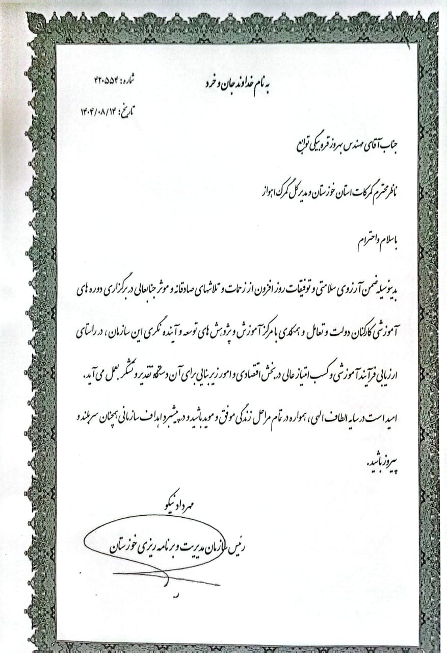 ستاد نظارت گمرکات استان خوزستان بر اساس نتایج ارزیابی عملکرد آموزش دستگاههای اجرایی در سال ۱۴۰۳ که از سوی سازمان مدیریت و برنامهریزی استان اعلام شد، در میان ۶۴ دستگاه ارزیابیشده در بخش تولیدی، اقتصادی و امور زیربنایی موفق به کسب سطح عالی و عنوان دستگاه برتر شد.