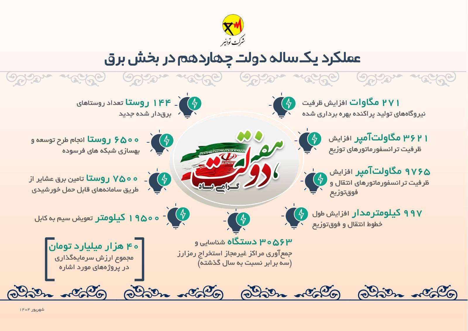 🔹 برقدار شدن ۱۴۴ روستا 🔹 اجرای طرح توسعه و بهسازی شبکههای فرسوده در ۶۵۰۰ روستا 🔹 تأمین برق عشایر در ۷۵۰۰ روستا از طریق سامانههای خورشیدی 🔹 تعویض ۱۹۵۰۰ کیلومتر سیم به کابل 🔹 شناسایی و جمعآوری بیش از ۳۰ هزار دستگاه ماینر غیرمجاز 🔹 افزایش ظرفیت نیروگاههای پراکنده به میزان ۲۷۱ مگاوات 🔹