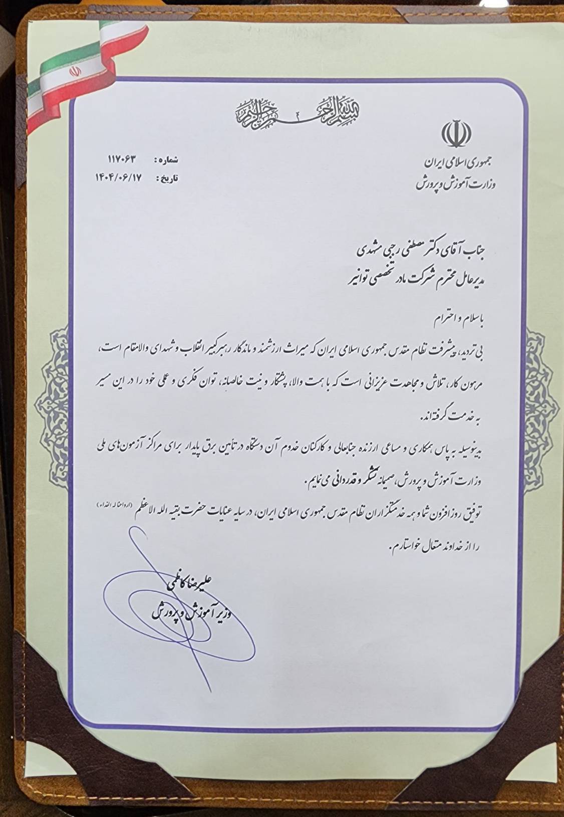 ✨ بدینوسیله به پاس همکاری و مساعی ارزنده جنابعالی و کارکنان خدوم آن دستگاه در تامین برق پایدار برای مراکز آزمونهای ملی وزارت آموزش و پرورش صمیمانه تشکر و قدردانی مینمایم.