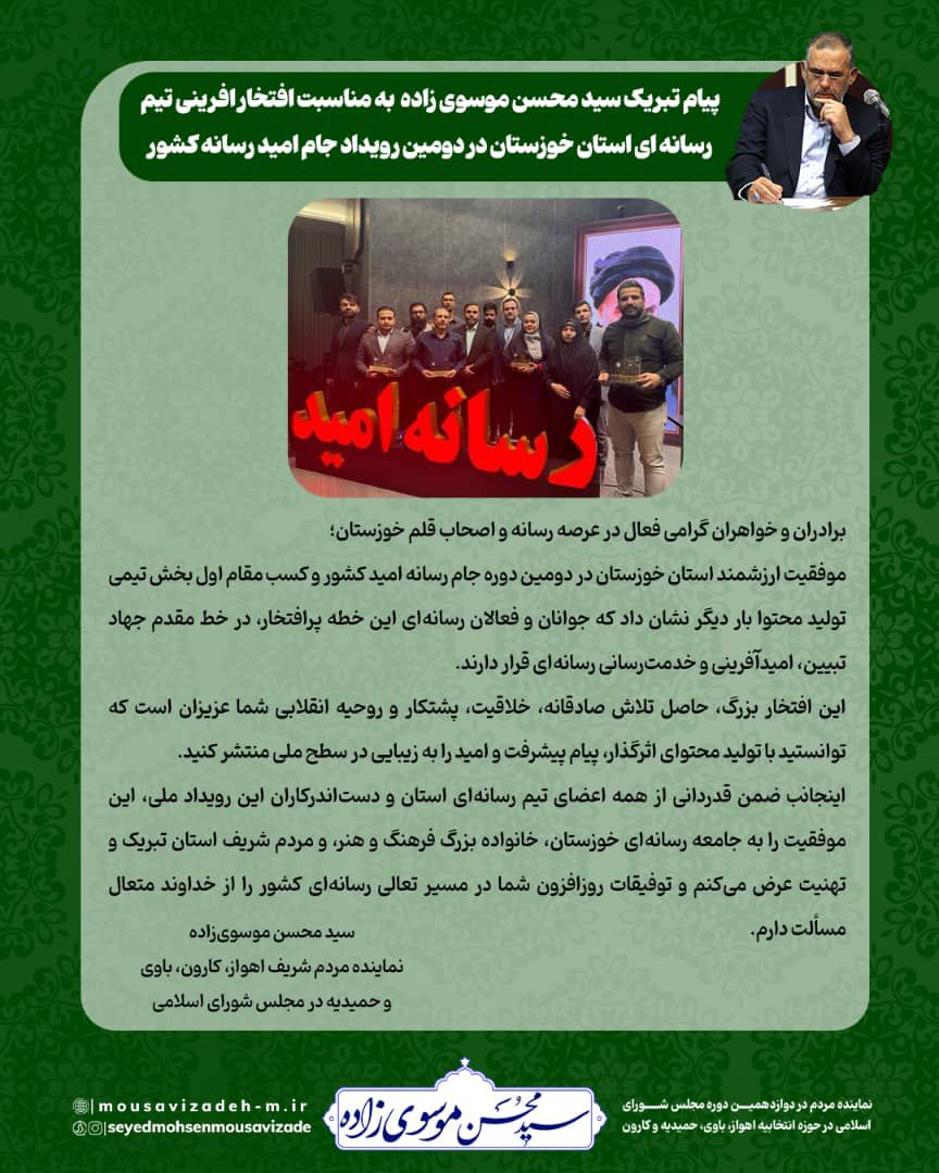 اینجانب ضمن قدردانی از همه اعضای تیم رسانهای استان و دستاندرکاران این رویداد ملی، این موفقیت را به جامعه رسانهای خوزستان، خانواده بزرگ فرهنگ و هنر، و مردم شریف استان تبریک و تهنیت عرض میکنم و توفیقات روزافزون شما در مسیر تعالی رسانهای کشور را از خداوند متعال مسألت دارم.
